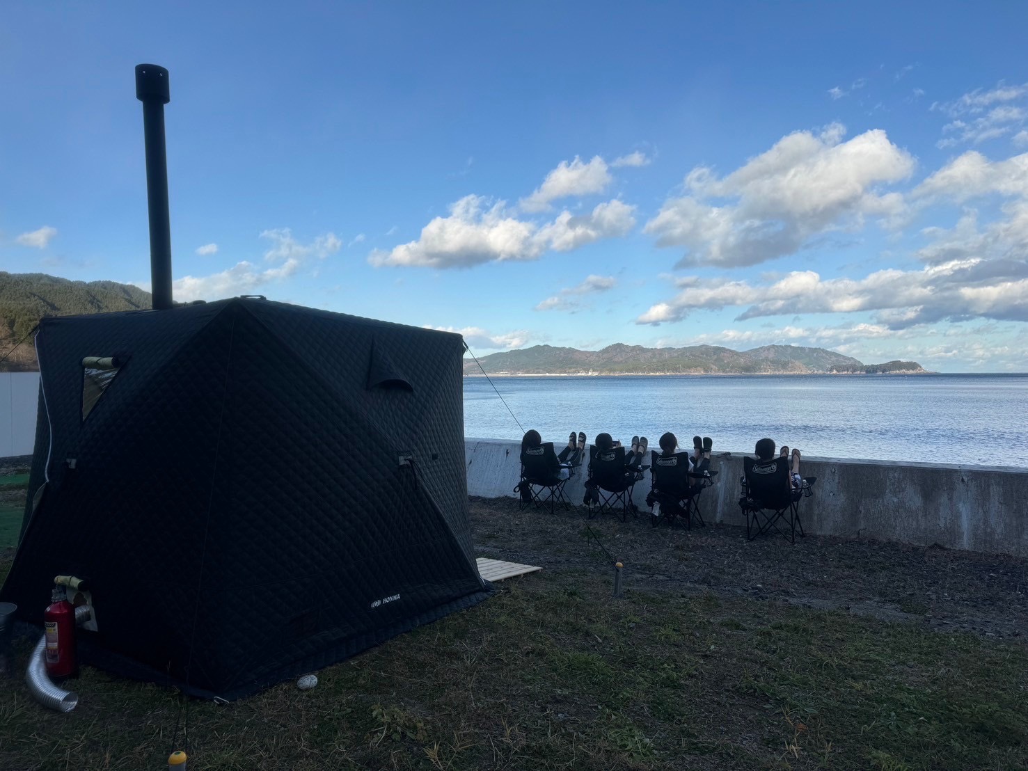 秋空の下で薪ストーブの熱と潮風の涼しさが生み出す、ここだけの極上リラックスタイムをお楽しみください。