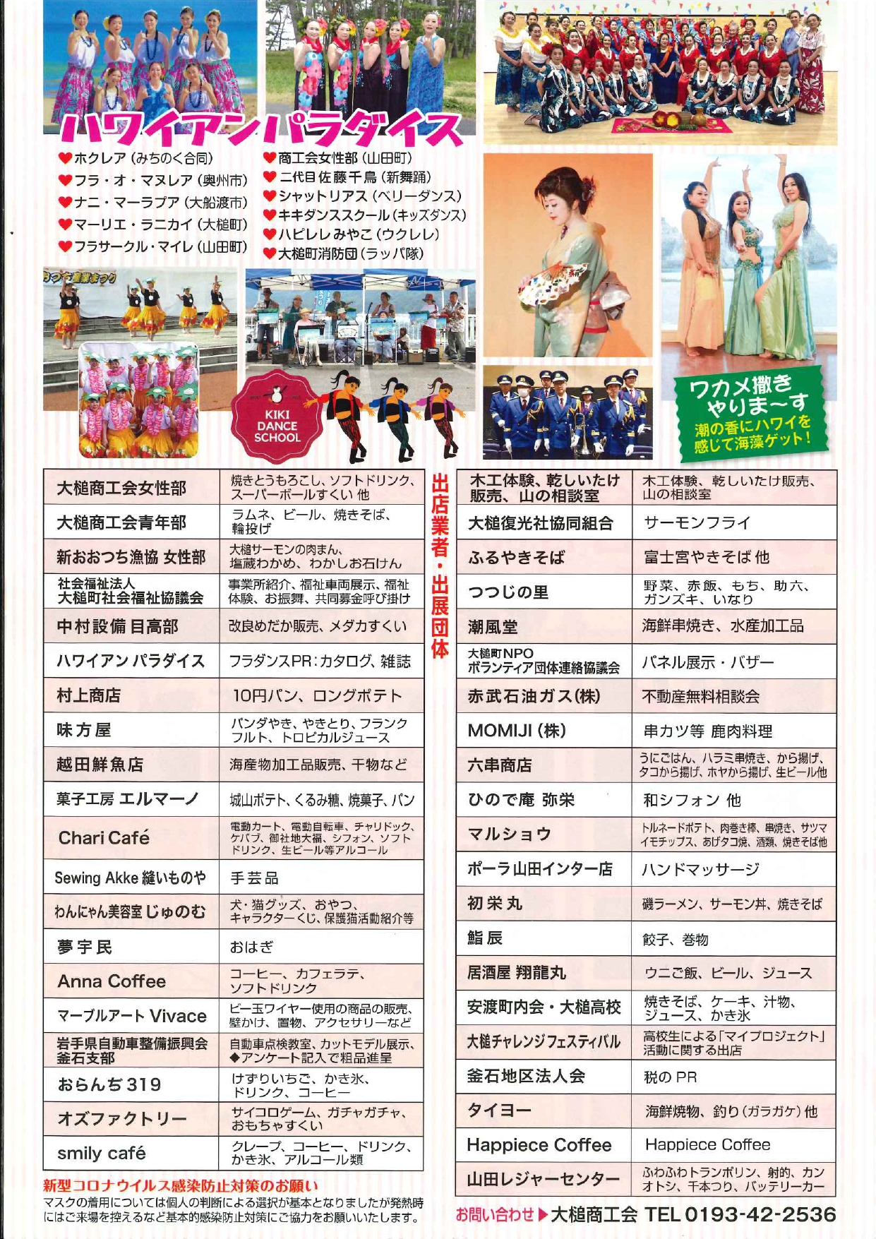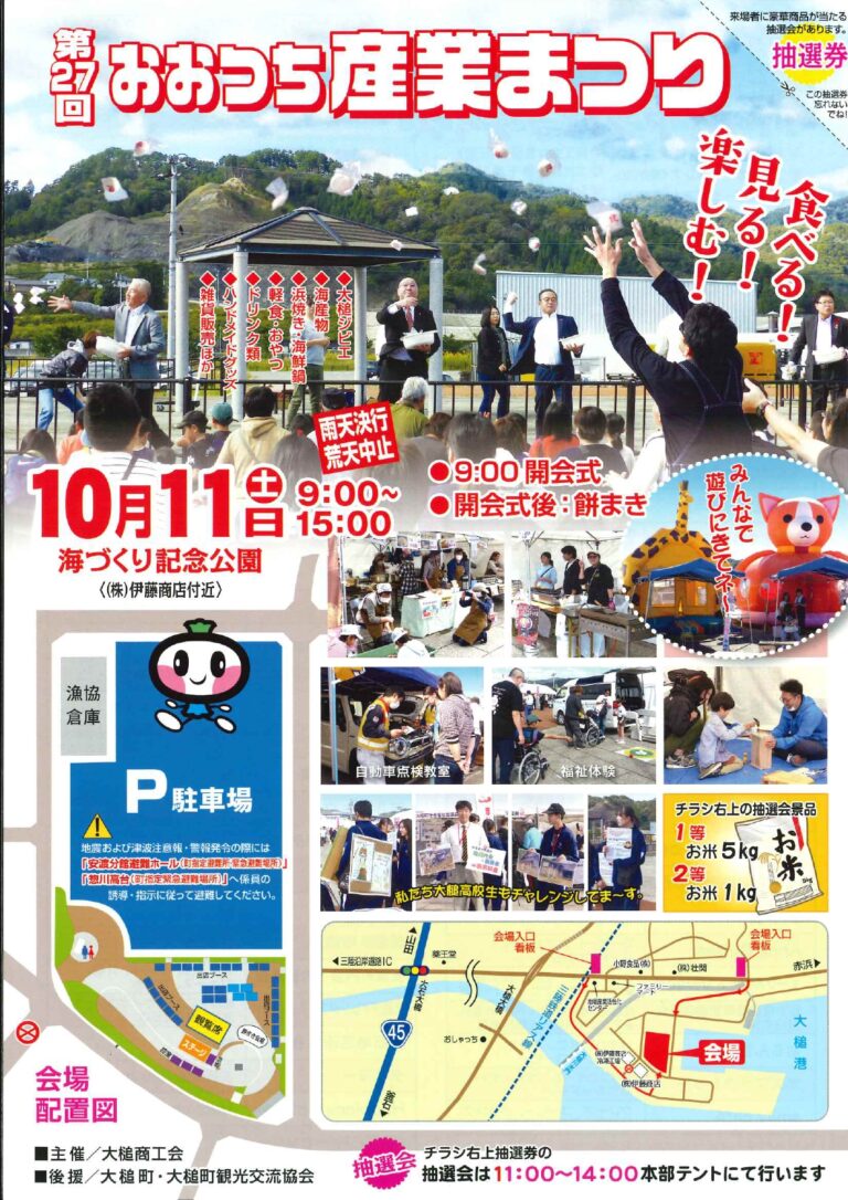 【終了】🌸 第27回 おおつち産業まつり 開催! 🌸 2025年10月11日(土) 地元の魅力がたっぷり詰まった産業まつりが今年もやってきます! 📅 日時:10月11日(土)9:00~※雨天決行・荒天中止📍 会場:海づくり記念公園 ✨ 開会式のあとは恒例の「餅まき」も!✨ 多数の出店が並び、グルメや特産品も大集合! ご家族・ご友人そろって、秋の大槌をまるごと楽しみにきてください! 開催日 2025年10月11日(土) 開催時間 09:00~15:00 開催場所 海づくり記念公園(岩手県大槌町) お問い合わせ 大槌商工会(TEL:0193-42-2536)