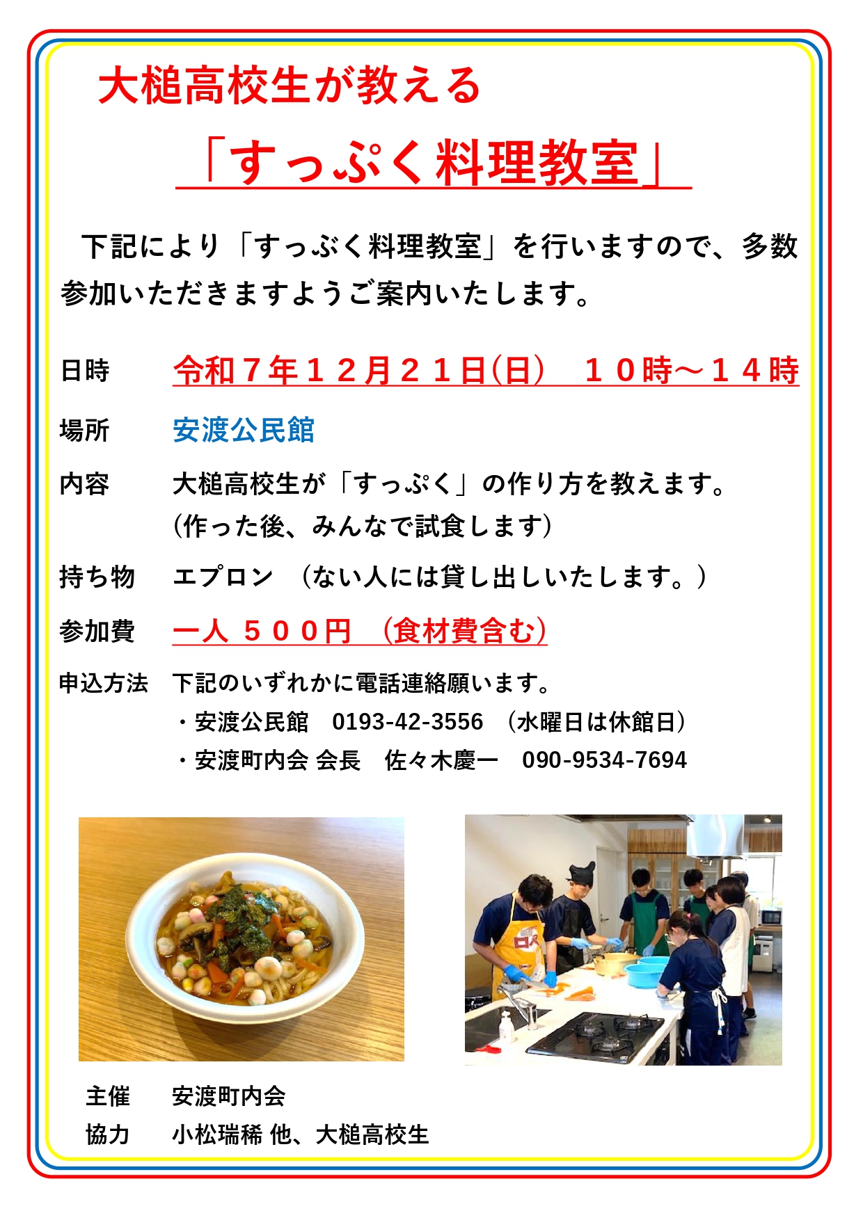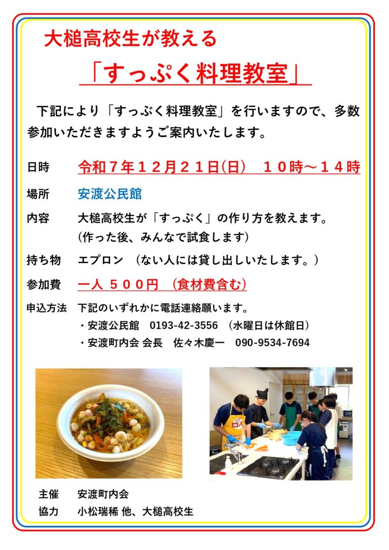 安渡町内会主催による「すっぷく料理教室」を開催します。