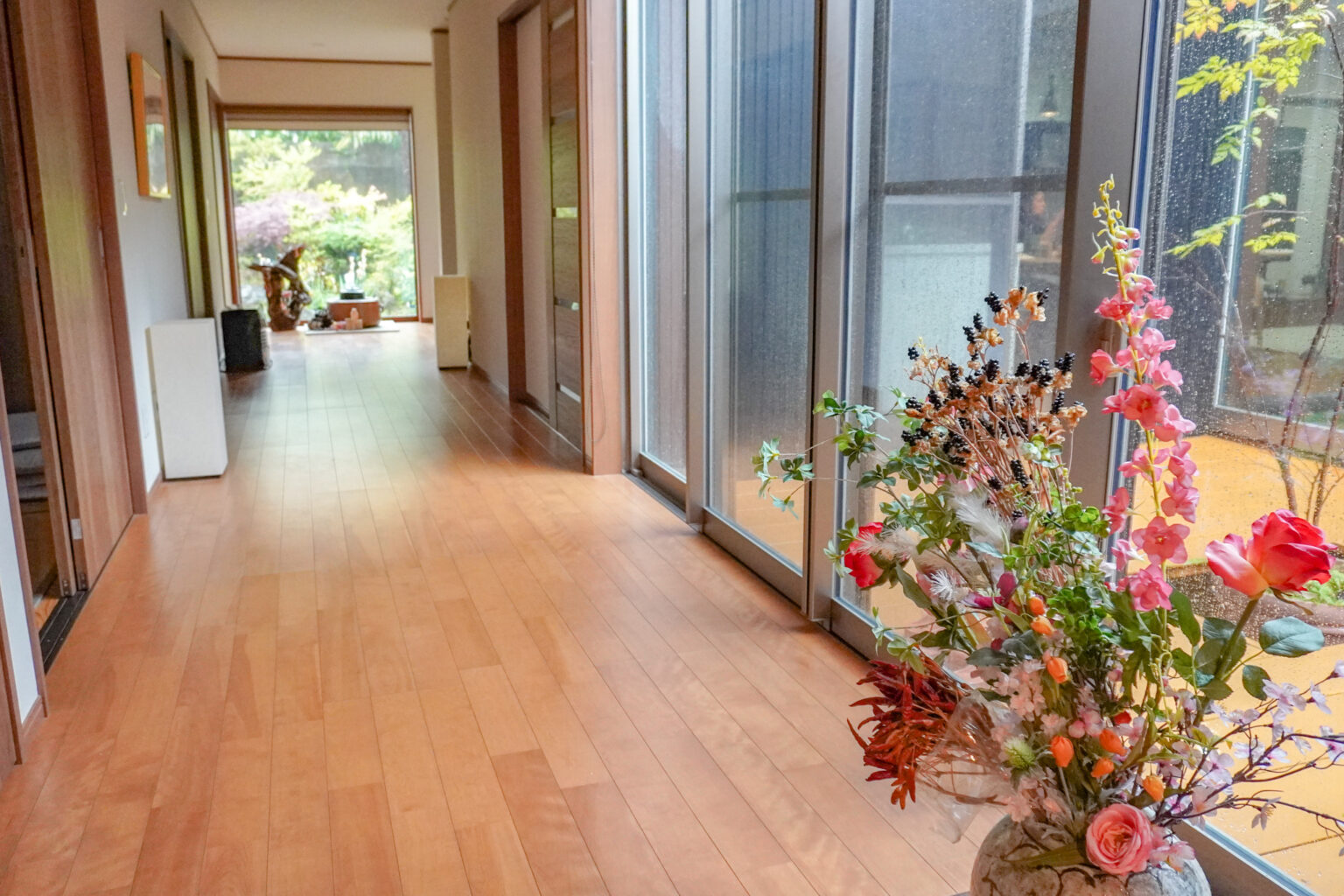 花で彩られた廊下や中庭の雰囲気も、お食事の時間を一層引き立てます。