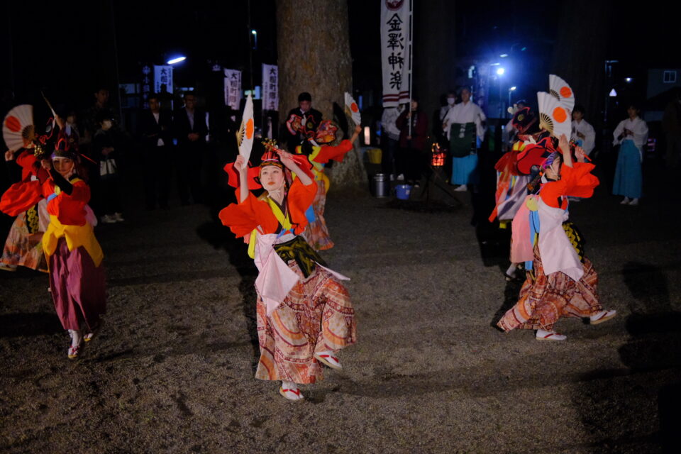 かがり火に照らされ、幻想的な雰囲気の中で勇壮に舞い踊る郷土芸能演舞を、荘厳な夜の小鎚神社でお楽しみいただけます。