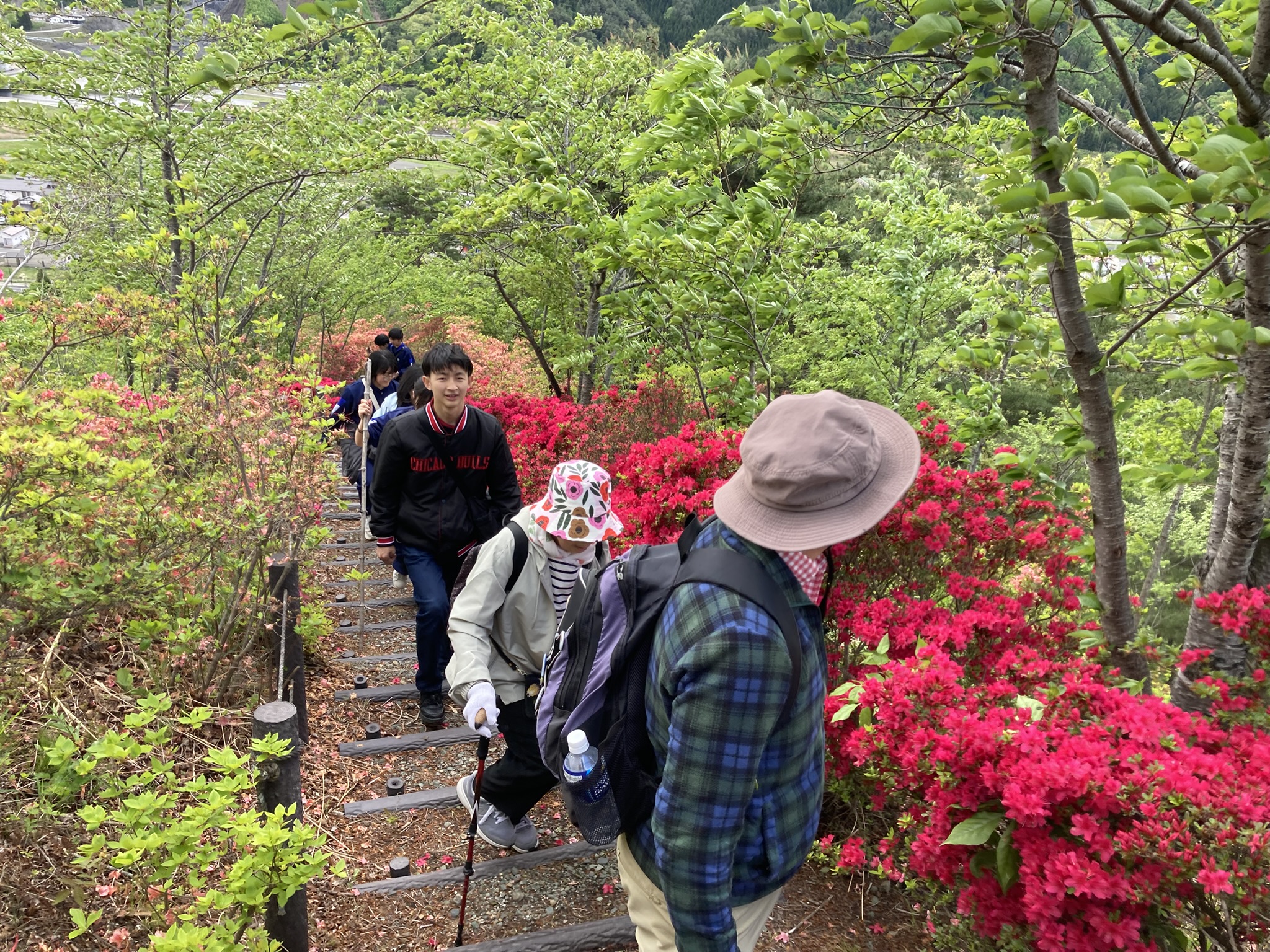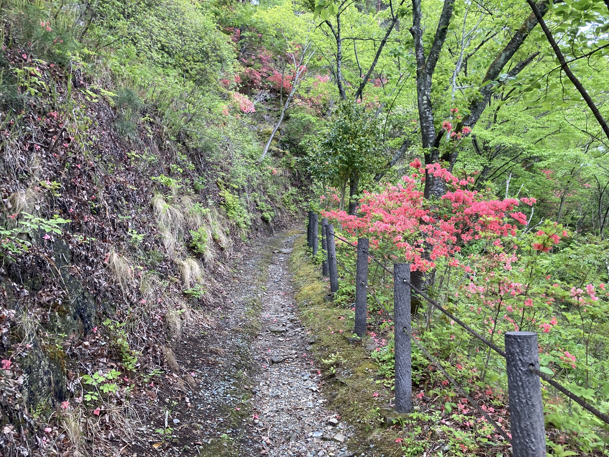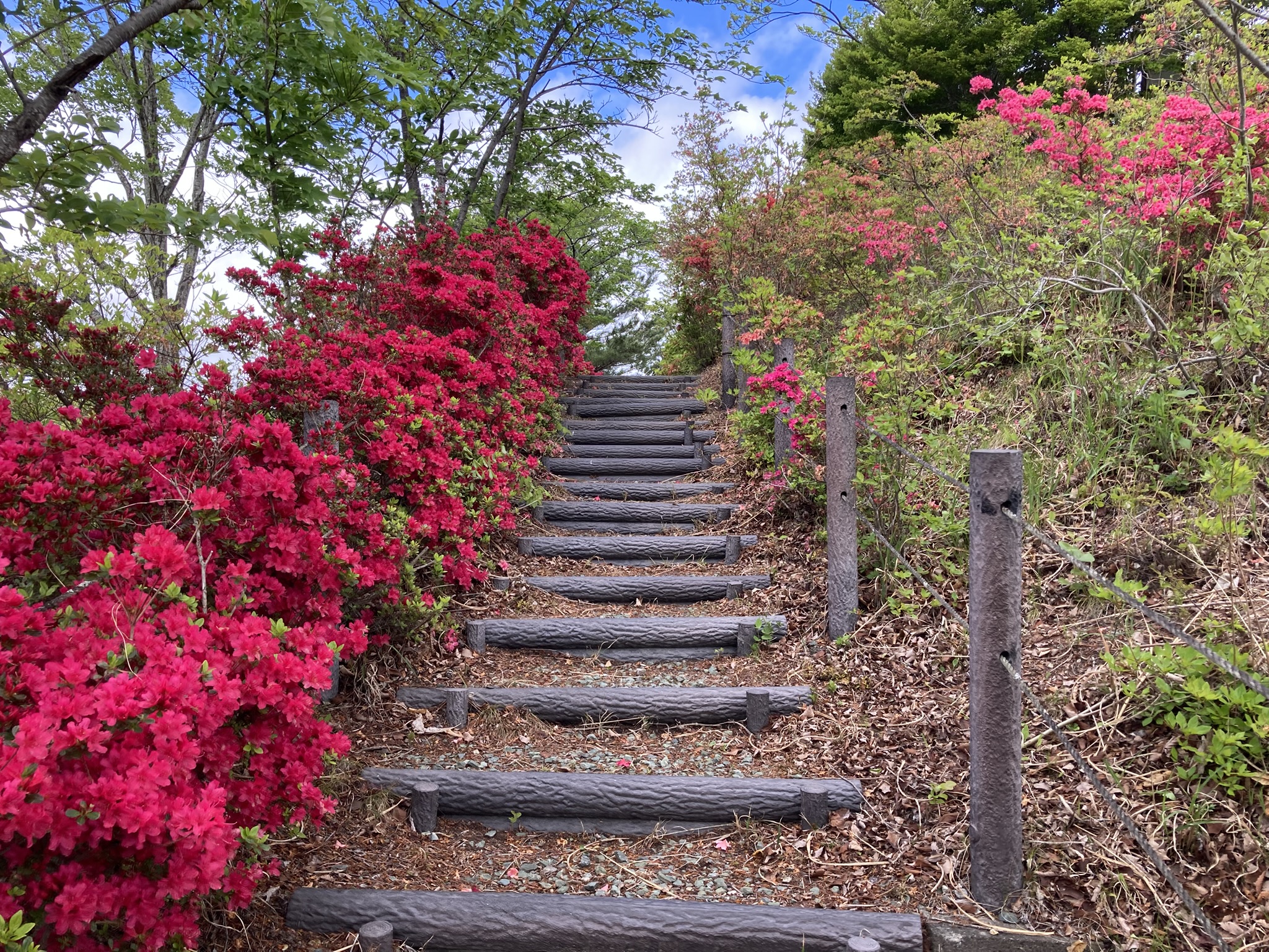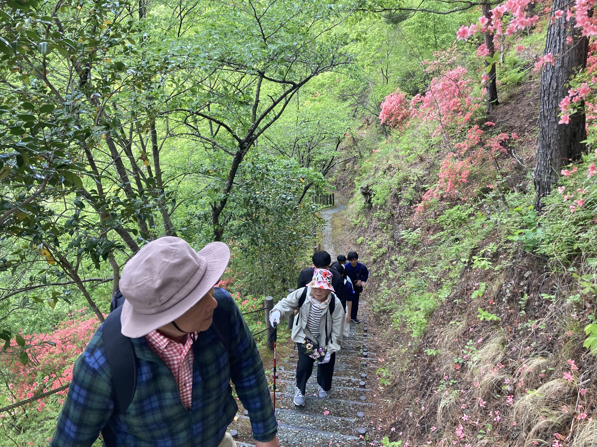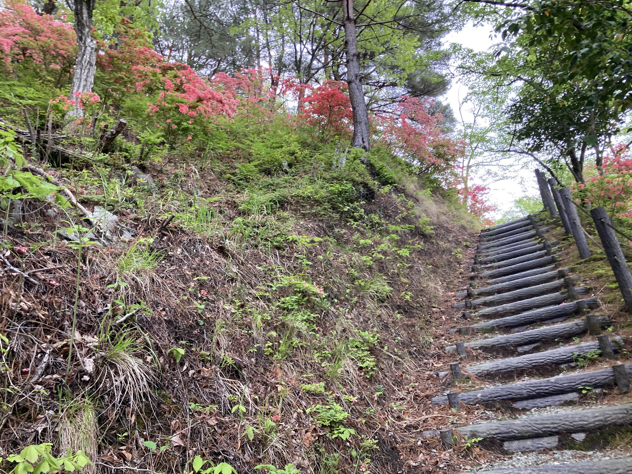 ここからは、20メートルから一気に100メートルほどの高低差を登る階段が続きます。その階段沿いに、ツツジが咲き誇る「つつじ回廊」が広がっています。