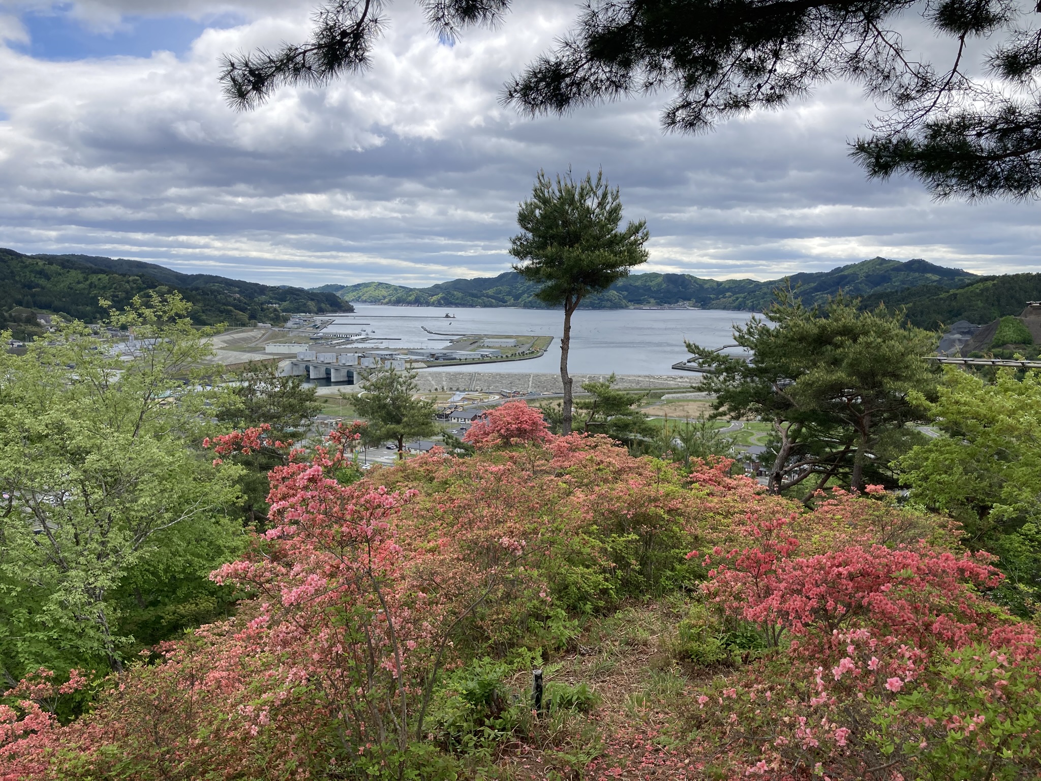 南の砦へは、西の砦から東に向かって階段を一気に下るルート。ここからも、街や大槌湾が一望できます。砦の周囲には数種類のツツジが植えられ、鮮やかに咲き誇っていました。