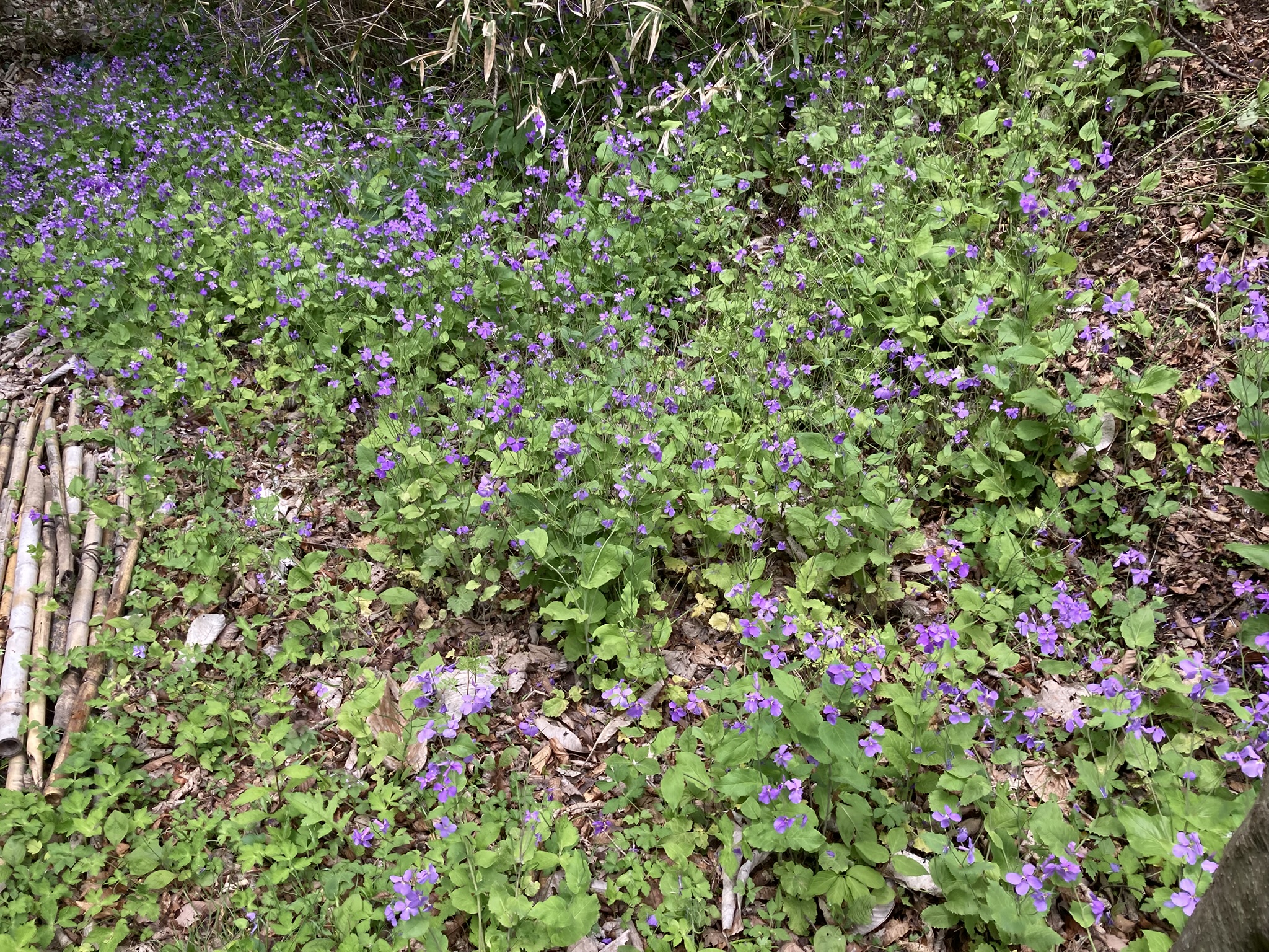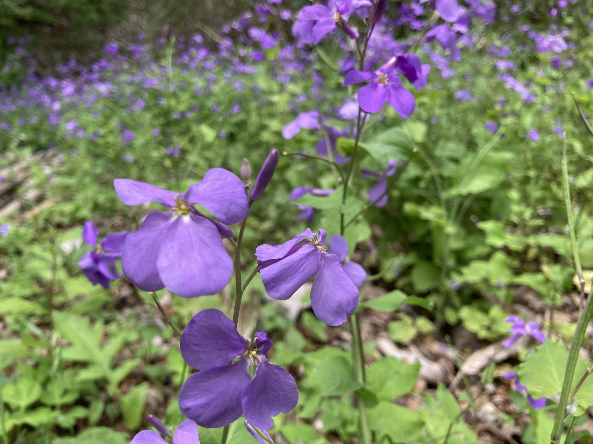 そこから町道を下り、城山公園の駐車場へ向かいます。途中には、ボランティアの方が植えたムラサキハナナ(オオアラセイトウ)が満開! 若葉香る新緑の山々を眺めながら、自然を満喫するひとときでした。